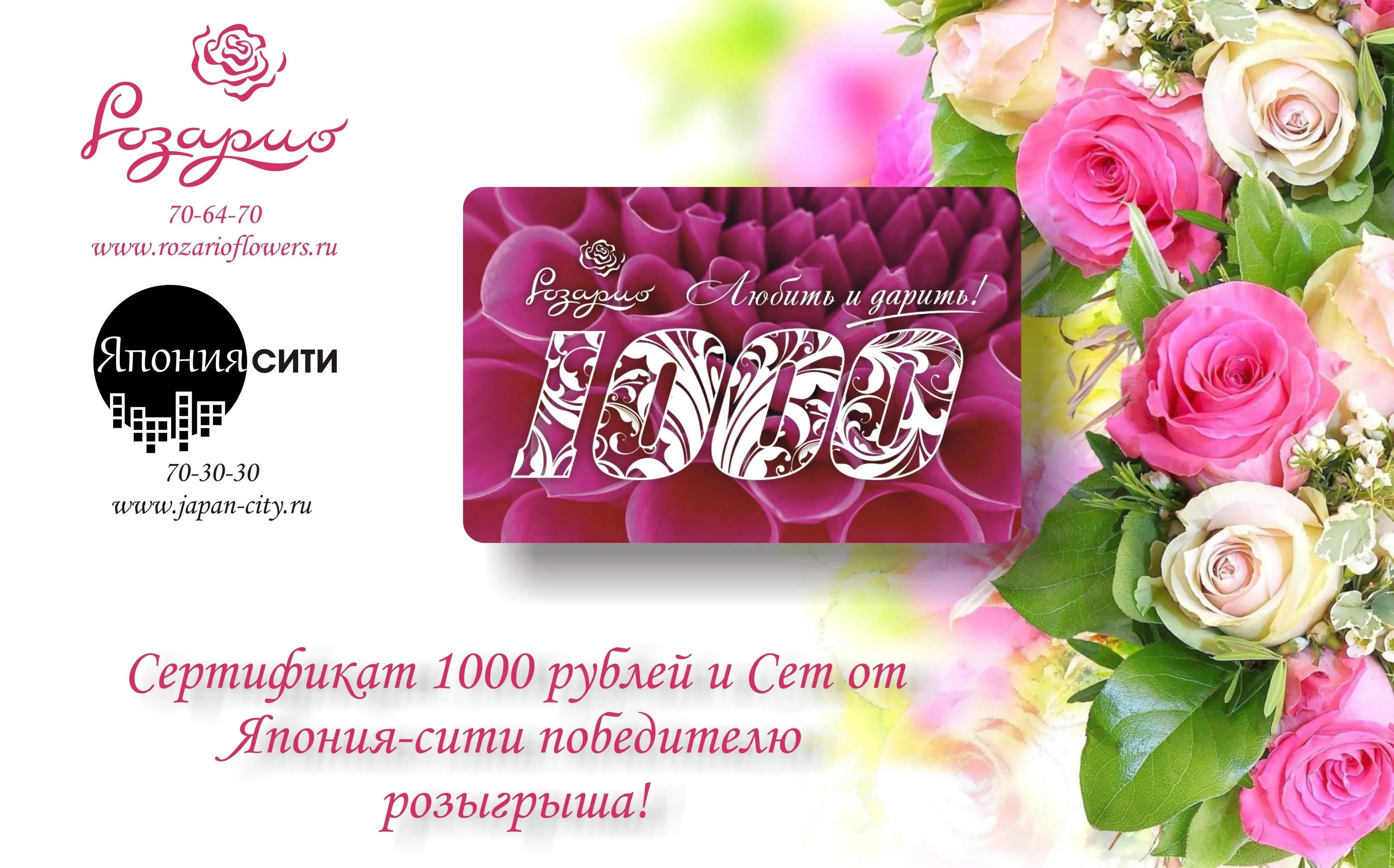 Победителем нашего конкурса со своей потрясающей, красочной, тёплой фотографией сталаИрина АртемкинаПоздравляем и приглашаем в цветочный центр Розарио для получения приза - подарочного сертификата на сумму 1000 р. ...